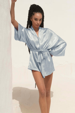 Ce kimono court en satin irisé à la coupe ample et la matière fluide vous enveloppera de douceur et d'assurance. C'est la pièce parfaite à porter à la maison ou pour briller la journée. Il permet de passer du bureau au dîner, du décontracté au chic !